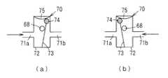 すなわち、負圧動作切換弁70は、図2に示すように、ケース72を有し、このケース72の一側に一方の分岐通路71aが、他側に他方の分岐通路71bがそれぞれ接続されるとともに、これら各分岐通路71a,71bの接続位置の中間に注出通路68が接続されている。ケース72内には、ばね性を有する可動板73が配置され、この可動板73の一端がケース72の一端に固定され、他端は自由端として摺動部材74が取り付けられている。ケース72の他端には、摺動部材74が当接する反転用凸部75が形成されている。そして、図2(a)に示すように、可動板73の摺動部材74が反転用凸部75の頂部より他側に係合した状態で、一方の分岐通路71aがケース72内を通じて注出通路68に接続され、他方の分岐通路71bが可動板73で注出通路68から遮断された閉止状態とされる。また、図2(a)において、一方の分岐通路71aに接続された一方の原料液容器65a内の原料液を使い切った際、一方の分岐通路71a側の負圧が他方の分岐通路71b側より所定値以上になり、この圧力差によって可動板73の摺動部材74が反転用凸部75の頂部を乗り越えて他側に係合するように反転し、つまり図2(b)に示すように、可動板73の摺動部材74が反転用凸部75の頂部より一側に係合した状態で、他方の分岐通路71bがケース72内を通じて注出通路68に接続され、一方の分岐通路71aが可動板73で注出通路68から遮断された閉止状態とされる。