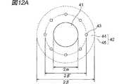 図11は、本発明の第3の実施の形態に係る光ファイバ10Hのファイバ軸方向の断面図である。また、図12Aは、図11における光ファイバをI−I線で切断した断面図であり、図12Bは、図11における光ファイバをII−II線で切断した断面図である。第3の実施の形態に係る光ファイバ10Hは、ファイバ軸方向に区間aと区間bとが交互に配置されており、区間aでは内側クラッド領域44に空孔43を含むが、区間bでは空孔43を含まない。区間aと区間bの間には、遷移区間cが存在し、遷移区間cでは空孔断面積がファイバ幅方向に変化している。区間aと区間bの長さは、典型的には100m以上である。一方、遷移区間cの長さは1m以下とすることができる。この時、遷移区間cの光学特性が光ファイバ全体の光学特性に及ぼす影響は無視できる。コア領域41の直径は2αであり、区間a及び区間bにおいて同一の値である。図12Aに示すように、区間aでは、ファイバ軸を中心とする半径β’の円周上に8個の空孔43(半径r)が等間隔で配置されている。区間aにおける屈折率分布は、空孔43を含む円環領域であるディプレスト部を有する屈折率分布に相当し、区間bにおける屈折率分布は、ディプレスト部を有さない屈折率分布に相当する。また、第1及び第2の実施の形態と同様に、内側クラッド領域44の外半径はβ=2β’−αとし、外側クラッド領域45の外半径はγとする。  FIG. 11 is a sectional view in the fiber axis direction of an optical fiber 10H according to the third embodiment of the present invention. 12A is a cross-sectional view of the optical fiber in FIG. 11 cut along line II, and FIG. 12B is a cross-sectional view of the optical fiber in FIG. 11 cut along line II-II. In the optical fiber 10H according to the third embodiment, the sections a and b are alternately arranged in the fiber axis direction. In the section a, the