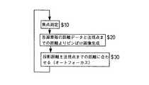 図6に示す基本アルゴリズムは、上記構成要素を用いて行う表示手順を示している。まず、焦点測定装置1によって、眼Eの視距離を検出する($10)。検出された視距離と、原画像の各画素についての距離データと、から各画素のピンボケ度合い(ピンボケ量)を算出し、その結果に基づいて原画像の画像データにピンボケ処理を施して、画像の表示データを生成する($20)。そして、ピンボケ処理が施された画像の表示データを表示素子3で表示し、その画像を接眼光学系4で虚像として投影し、その虚像を投影距離可変機構5で注視点の位置に投影する($30)。