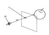 このとき同時に、投影する映像に立体感を高めるための画像処理を施す。つまり、観察者Pが2m先のリンゴを見ているときには、図2(b)に示すようにリンゴをくっきり見せて木の方をぼかす画像処理を行い、観察者Pが50m先の木を見ているときには、図2(c)に示すように木をはっきり見せてリンゴをぼかす画像処理を行うのである。このように、原画像中に観察者Pからの距離が異なる表示物が2以上存在する場合には、各表示物を構成する画素について遠近関係(つまり距離データ)を検出し、観察者Pが見ていない表示物をピンボケ表示することによって、自然な遠近感のある立体映像を構成する。