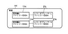 受信機11とコンテンツをやりとりできる機器はレコーダプレーヤ21,22であり、受信機12とコンテンツをやりとりできる機器はレコーダプレーヤ23,24である。そして、受信機11,レコーダプレーヤ21,22がファミリーH1として一つの家庭内機器、又受信機12,レコーダプレーヤ23,24がファミリーH2として別の家庭内機器と定義する。同一家庭に受信機が二つある場合を除いて、例えば、一つのレコーダプレーヤ23が受信機11と受信機12の両方と同時にファミリーとなることはない。そのため、受信機11nで受信した家庭外コピー制限のかかったコンテンツはファミリーH2の機器へのコピーなどはできない。