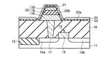 図17及び図18に示すように、第1の実施形態の変形例3において、上記基本例1と異なる点は、上部電極20の上方において、第1及び第2の水素バリア膜23,25が接触していない点である。つまり、第1の水素バリア膜23における第3の部分23cと第2の水素バリア膜25における第6の部分25cとの間に、介在層24が存在する。  As shown in FIGS. 17 and 18, the third modification of the first embodiment is different from the first basic example in that the first and second