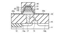 次に、図19に示すように、マスク層40を用いて、第1の水素バリア膜23の第1の部分23a上の介在層24のみがエッチングされる。これにより、強誘電体キャパシタ22の側面及び上面部分にのみ介在層24を残すことができる。  Next, as shown in FIG. 19, only the intervening