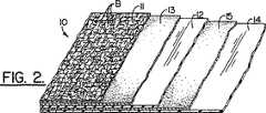 あるいは、構成成分14は不織布でもよく、伸張性でも本質的に非伸張性にも構成できる。例えば、不織布は、布11と類似のマルチポリマー繊維の別の布も可能なため、布10′の両面に繊維性の布が使用される。Hercules Type 196ポリプロピレンステープル繊維の様な伸長度の小さい梳いて熱点結合された布の様な、本質的に非伸張性の不織布も利用できる。