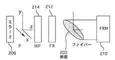 干渉し合う偏光方向は、図2を参照することによってより良く理解し得る。図2は利得媒体202における高複屈折エルビウムドープ処理ファイバーの断面203を示す。図2の座標系においては干渉し合う二つの偏光方向がx軸およびy軸で示されている。