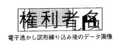 次に、その結果であるメモリ画像に対して、先のステップs02で保存した透かしの属性を情報として付加する処理(電子透かしを繰り込む処理)を行う。次に、メモリ上のワークエリア45に保存したメモリ画像(図6)を取得して、そのメモリ画像にメモリ上のデータエリア44から取得したこの電子透かし図形の電子透かし情報を付加する。この付加は、公知である電子透かし付加方法により透かし込み画像(図7)を新たに生成した上で、それをメモリ上のワークエリア45に保存する(ステップs10)。