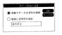 本実施の形態においては、まず、第2の実施の形態のフィールド図形に対して、表示装置上の図9に示すような領域から透かし属性を設定できるものとする。この例では、文字列データがフィールドに後付けで送られるものと仮定して、その文字列内容を電子透かし情報に付加するか、あるいは自分で固定的に付加するべき文字列を自動的に設定できるという二つの設定方法を設けた。