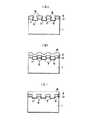図1及び図2は、本発明による窒化物系3−5族化合物半導体の製造方法の実施の形態の一例を模式的に示す製造工程説明図であり、図1にはSi基板上に第1の窒化物系3−5族化合物半導体を部分的に設け、これにより部分的に露出したSi基板の表面を窒化処理するまでの工程が示されており、図2には図1に示した工程により得られたSi基板上に部分的に設けられた第1の窒化物系3−5族化合物半導体上に第2の窒化物系3−5族化合物半導体を横方向選択エピタキシャル成長させ、これにより結晶性の改善された窒化物系3−5族化合物半導体を得るまでの工程が示されている。