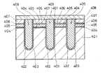 この構造では、トレンチ409によって、素子領域を分離すると同時に、浮遊ゲート405及び制御ゲート407もメモリセル毎に分離しており、微小なセル面積を実現するものと期待されている。