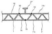 図1は本発明の一実施例で、中空アルミ押出し形材1,1′で構成された裏表に溶接線が生じる構体の一部を示している。図4のように、一般に鉄道車両構体は、主に左右の側構体ブロック,屋根構体ブロック,妻構体ブロック及び台枠ブロック等の構体ブロックより構成される。各構体ブロックを製作する場合、複数の中空アルミ押出し形材を作業盤上に並べ、溶接線10を溶接でつなぎあわせていく。図1は中空アルミ押出し形材1と隣合う別の中空アルミ押出し形材1′とを塞ぎ形材2を介して溶接で溶接した状況を示している。図1、図2から明らかなように、形材1は、実質的に平行な外板1aと内板1bと、両者を斜めに接続する複数の接続板である第3の板1cと、からなる。それぞれの接続板は外板1a、内板1bにトラス状に接続している。形材1の幅方向の端部において、外板1aの端部は内板1bの端部よりも突出している。端部の接続板は突出した外板1aの途中に接続している。内板1bの端部に2つの接続板が接続している。この接続部から内板1bの端部側に向けて板が突出している。この板の突出部は短い。この板は外板1a側に凹んだ位置にあり、凹部を設けている。凹部に塞ぎ形材2の端部が重なる。形材1′は形材1と同様の構成である。