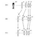 また、図9(A)・図9(B)・図9(C)は、従来のズームレンズ鏡筒の各状態にあるときの各撮影レンズ群の概略位置を示しており、図9(A)は、非撮影時に各撮影レンズ群が格納位置にある沈胴状態を、図9(B)は、各撮影レンズ群が撮影状態にあり、短焦点(又は広角;ワイド)位置にある状態を、図9(C)は、各撮影レンズ群が撮影状態にあり長焦点(又は望遠;テレ)位置にある状態をそれぞれ示している。まず、この図9(A)・図9(B)・図9(C)によって、上記ズームレンズ鏡筒を構成する各撮影レンズ群の各状態時の位置関係を、以下に簡単に説明する。