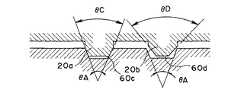 まず、スライド金型による場合のカム溝では、EE断面の傾斜角度θ3は、変倍領域用及び沈胴領域用の二つのカム溝に共通しているが、カム曲線Fは、光軸に対して傾斜しているために、カムピンと接する部分の実際の角度は、カム曲線Fに垂直な断面での開口角度θ4・θ5(図15のCC断面・DD断面参照)となる。