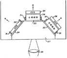 この実施例によれば、3つの光検出器28、29、30を有する特別のカメラが使用されている。そして、プリズム27は収集された光を3つの像に分割し、これらの像は3つの独立した光検出器によって撮像される。光検出器28、29は光増幅器37、38を有するCCD撮像装置を備え、また、光検出器30は通常のCCD撮像装置を備えている。各光検出器はフィルタ32、33、34をそれぞれ有しているとともに、x,y,zマイクロ位置決め装置をそれぞれ備えている。フィルタ32、33は前述した実施例と同様であり、500±20nmの緑フィルタ32および630nmのロングパスフィルタ33を構成している。また、CCD撮像装置30は、広帯域の青フィルタ34を備えている。