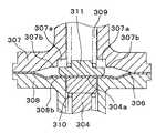 また、311は第1コイルばね309のばね座を兼ねるプレート(剛体)であり、このプレート311は、ダイヤフラム306より剛性が高くなるように所定の厚みを有して金属にて構成されている。そして、プレート311は、図5、6に示すように、上側支持部材307に形成された段付き部(ストッパ部)307aに接触することにより、ダイヤフラム306が、その厚み方向一端側(密閉空間305側)に向けて所定値以上に変位することを規制している。