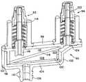 図3に示された濾過及び空気除去システムの詳細は、図4を更に参照してシステム90の展開図で見ることができる。図から明らかなようにニードル弁アセンブル92,94は、好ましくは、実質的に同一である。これらアセンブリ92,94は長寸のニードル114,122をそれぞれ含み、それらニードルはポート116,124と、O-リング130,132等の弾性封止装置によってそれぞれ封止状態で結着されている。弁ばね134,136はニードル・フランジ138,140及びばね付勢装置142,144の間の長寸ニードル114,122回りにそれぞれ配置されている。ばね付勢装置142,144は円筒状弁146,148をそれぞれ担持し、それら円筒状弁は長寸ニードル114,122を貫通させるように内部に受け取る環状開口150,152を有する。弁ガイド154,156は上部96に結着され、ばね付勢装置142,144のフランジ162,164と係合する弁移動停止棚部158,160を収容する。
