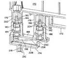 次に図5で参照されるように、インクカートリッジ170(カートリッジ10と同様)、ガス蓄積チャンバー172(ガス蓄積チャンバー26と同様)、並びに、濾過及び空気除去システム174(システム90と同様)の部分的な断面図が示されており、その濾過及び空気除去システム174がインクカートリッジ170と係合的に連結された状態である。インクカートリッジ170と濾過及び空気除去システム174とが連結されると、インク供給ポート176と空気泡若しくはガス泡除去ポート178は弁180及び182と係合し、次いで、それらはばね付勢装置184及び186を濾過及び空気除去装置174の上方部188へ向かって付勢する。弁180及び182を下方へ付勢する及んで、ニードル194及び196のインク・インレット穴190及びガス・アウトレット穴192は覆いが外れて、フィルタ・キャビティ198がインク・ニードル194によってインクカートリッジのインク・アウトレットポート176と流動に関して連通するように連結される。同様に、ガス蓄積エリア200は空気泡或はガス泡除去ポート178と流動に関して連通するように連結されて、空気及び/或はガスをガス・アウトレット・ニードル196を通じてガス蓄積チャンバー172内へ流す。