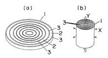図3は同心円状に積層するにあたり、中心軸に近いほど電極3,3間の距離が長くなるようにするとともに、各電極に印加する電圧を同一にしたもので、径が異なる各リング状伸縮部2の伸縮量をほぼ等しくすることができ、軸方向への均一な延伸機能を得ることができる。