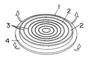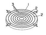 以下本発明を実施の形態の一例に基づいて詳述すると、図1及び図2において、図中2はシリコンゴムやアクリル等の絶縁性伸縮材料からなる伸縮部、3は導電性伸縮材料からなる電極であり、伸縮部2はリング状に形成しているとともに、多数の径の異なるリング状伸縮部2を同心円状に形成しており、これら伸縮部2の間には夫々リング状の電極3を介在させるとともに、最外周面と最内周面にもリング状の電極3を配して、各伸縮部2の内周側と外周側とに夫々電極3が位置するようにしてある。そして図1に示すように、一つおきの電極3を直流電源のプラス側に、残る電極3を直流電源のマイナス側に接続している。