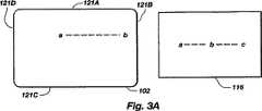 第3A図にはディスプレイ116も図示されている。本発明のこの例では、タッチパッド102は相対カーソルロケーティングデバイスとして働く。ディスプレイ116内に3つのカーソル位置a,b,cがある。カーソル位置aは開始カーソル位置を表す。カーソル位置cは所望の終止カーソル位置を表す。タッチパッド102上で、位置aはスタイラスやユーザの指等のポインティング対象の開始位置、およびユーザがテキストや他の対象をディスプレイ上の所望位置cへ動かすためのドラグ操作を開始する位置を表す。タッチパッドは相対カーソル位置決め装置として使用されるため、残念ながら、ユーザがタッチパッド102のライトエッジ121Bの位置bへポインティングオブジェクトを動かした時、カーソルはディスプレイ116上の対応する位置bへしか到達しない。次に、ユーザはタッチパッド102の表面からポインティングオブジェクトを引き上げなければならず、本発明に依らない場合、それによりドラグ操作は終止する。ポインティング対象を引き上げることにより、カーソルは開始位置aへ素早く戻ってしまうことさえある。ポインティングオブジェクトは第3A図−第3C図に明示されてはいないが、ユーザの指や任意他の適切なオブジェクトとすることができる。
