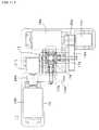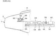 これらの図から明らかなように、ダッシュボードA内に設けられたベース51上には、2本の案内軸52,53と1本のボールねじ54とが互いに平行に取り付けられている。ボールねじ54は、軸受55によって回転自在に支持されており、その一端には、ジョイント56を介して前後進用の第1のモータ57が連結されている。また、当該ボールねじ54には、ナット58を介して移送板59が前後動可能に取り付けられており、当該移送板59は、スライダ60を介して前記案内軸52,53に摺動自在に取り付けられている。前記移送板59の先端部には、軸受61によって回転自在に支持された回転軸62が、案内軸52,53及びボールねじ54と直角に取り付けられており、当該回転軸62の先端部に車載用入力装置1の筐体2が固着されている。前記回転軸62には、大歯車63が固着されており、この大歯車63は、第2のモータ64の主軸に固着された小歯車65と噛み合わされている。