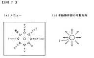 図7(a),(b)に示すように、本例の車載入力装置1は、手動操作部3をセンタ位置より前、右前、右、右後、後、左後、左、左前の各方向に操作することによって、それぞれラジオ、エアコン、カーナビゲーションシステム、CDプレーヤ、テレビジョン、監視カメラ、電子メール、電話を選択できるようになっている。なお、車載入力装置1に備えられた押釦スイッチ4a,4b,4c,4d,4e,4f及び5a,5b,5cによって選択される電気機器の種別と当該手動操作部3を操作することによって選択される電気機器の種別とは、同種の電気機器の組み合わせとすることもできるし、異種の電気機器の組み合わせとすることもできる。本実施形態例においては、押釦スイッチ4a〜4f及び5a〜5cによって選択される電気機器の種別と手動操作部3を操作することによって選択される電気機器の種別とを、異種の電気機器の組み合わせとしている。