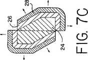 図7A〜図7Cは、図6のものと類似した本発明のさらにもう一つの実施形態を示している。しかしながら、この実施形態では、内側ブレード要素24は、組織接触縁又は表面のところの点までテーパしている。この実施形態では、最大量の電流が、ブレードが組織を切断するときに一方のブレードの外側ブレード要素と他方のブレードの内側ブレード要素との間で流れることになると考えられる。内側ブレード要素の表面42の幅が広ければ広いほど、同一ブレードの電極(内側要素と外側要素)相互間で電流はそれだけ一層多く流れ、表面42の幅が狭ければ狭いほど、対向したブレードの電極(内側要素と外側要素)相互間で電流がそれだけ一層多く流れることになる。表面42の幅が両極エネルギについての典型的な電流路長さよりも大きいと(即ち、幅が約0.050インチ以上であると)、電流の殆どは、同一ブレードの電極(内側要素と外側要素)相互間で流れることになろう。