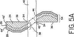 より詳細には、図5Aに示すように、各ブレードは、内側ブレード要素24、内側ブレード要素の外面だけを覆う絶縁材26及び内側ブレード要素の外面を完全に覆う外側ブレード要素28を有する。この構成では、各ブレードの組織接触縁が切断のために組織40に接触すると、電流が同一ブレードの内側要素と外側要素の表面42,44相互間、及び対向したブレードの内側ブレード表面42と外側ブレード表面44の間で流れることは理解されよう。ブレードを図5Bに示すように閉じ位置に動かすと、電流は同一ブレードの外側ブレード表面44と内側ブレード表面42の間、及び対向したブレードの内側ブレード要素と外側ブレード要素との間で流れると考えられる。ブレードを図5Cに示すように完全に閉じると、各ブレードの内側電極と外側電極の前方表面38及び後方表面54は露出され、各ブレードの電極が組織に接触していると、電流が引き続き各ブレードの電極相互間で流れることができる。