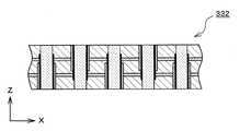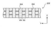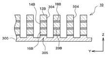図1に示されるS101では、図3に示されるように、複数の基礎溝22,24が形成される。具体的には、積層体10の上面10A側から、X方向に一定間隔2×Tをもって、複数の基礎溝(第1溝)22が形成される。この場合において、複数の基礎溝22におけるピッチは、複数の振動素子におけるピッチTの2倍とされる。上記と同様に、積層体10の下面10B側から、X方向に一定間隔2×Tをもって複数の基礎溝(第2溝)24が形成される。それらの複数の基礎溝24におけるピッチも複数の振動素子におけるピッチTの2倍である。ただし、複数の基礎溝22と複数の基礎溝24は、X方向において互い違いに形成されている。複数の基礎溝22及び複数の基礎溝24は、それぞれY方向に伸長した矩形の溝である。すなわち、それらの基礎溝22,24は互いに平行である。ここで、それらの基礎溝22,24の幅W1は、後述する特定構造(対向構造、隣合せ構造)(後の図9における符号200U,200Dを参照)を構築できる限りにおいて、適当な大きさに設定され、例えば、そのW1は0.08mmである。なお、積層体10は、一般に、積層されたn個の圧電部材によって構成され、ここでnは望ましくは奇数であり、特に望ましくは3である。