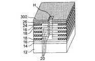 次に、ウェーハをMOCVD装置より取り出し、図14から分かるように、光露光プロセスによりレジストあるいはSiO2などからなるマスク300を形成する。そして、図14に示すように、反応性イオンエッチング(RIE)や反応性イオンビームエッチング(RIBE)等のドライエッチング法により、最下層のAl0.05Ga0.95N層16に達する矩形状の開口Hを形成する。その後、必要に応じてマスク300を除去した後、雰囲気の調整が可能な加熱炉へウェーハをセットする。そして、窒素ガスを4SLM流し、ウェーハ温度を1000℃まで約4分で昇温する。この過程においては、窒素雰囲気で加熱昇温することにより、ウェーハに付着していた水分や不純物ガスが除去される。なお、この昇温過程でのGaN層18の分解蒸発によるエッチングはほとんど無視できる。Next, the wafer is taken out from the MOCVD apparatus, and as can be seen from FIG. 14, a
