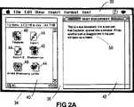 図2Bは、操作の結果を示し、図形アイコン45が左側ウィンドウ40のフォルダから右側ウィンドウ42の文字文書にドラッグされている。図2Aと図2Bに示されたようなデスクトップメタフォーを備えたインタフェースでは知られたことであるが、ドラッギングは、カーソル制御装置26を動作させてデスクトップ上やウィンドウ内でオブジェクトを移動したりコピーしたりする動作のことである。いったん、図形アイコンが文書の中に置かれると、その内容がフレーム52の中に表示される。文書は今や文字要素の他に図形要素を含んでいるのであるから、それは、複合文書として言及されるものである。文字50とフレーム52の中にある図形要素は別々のパートに属しており、これらが集合して文書を作り上げる。前述したように、パートは、内容とその内容の操作子とから構成される自己完結型のエンティティである。これら2つの構成要素は、そのパートがアクセスされたときは、それが、デスクトップのどこに位置していようと、常に利用可能である。従って、図2Aに示すように、図形アイコン45がウィンドウ40のフォルダに位置しているとき、それは、図形要素とその要素についてのエディタとを含むパートを表現している。そのパートがウィンドウ42の文書に移動したとき、その内容もパートとともに移動し、それらの内容のエディタの機能もユーザには利用可能である。