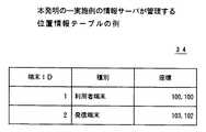 情報サーバ3は、情報発信端末2あるいは、利用者端末1からの要求の種別に応じて処理を行もので、利用者端末1や情報発信端末2との通信を可能とする送受信部32と、端末の位置を管理する位置情報テーブル34からなる。