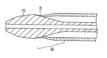 図5は、ダイレータの遠位端近傍の部分断面図である。ダイレータの遠位端には、遠位端から近位端方向に向かって、しだいに拡径する第一拡径部分16、第一拡径部分よりも緩やかにしだいに拡径する第二拡径部分17及びしだいに縮径する縮径部分18が構成され、さらに外径がほぼ一定の寸胴部分19に連続している。ダイレータの大きさ及び形状は、使用する患部に応じて適宜選定することができるが、通常は、第一拡径部分の長さが0.5〜10mm、第二拡径部分が4.5〜90mm、第一拡径部分と第二拡径部分の合計の長さが5〜100mmであり、縮径部分の長さが0.5〜50mmであることが好ましい。ダイレータの外径は、第一拡径部分の開始端において0.5〜3mmであり、第一拡径部分と第二拡径部分の境界において0.6〜4mmであり、第二拡径部分と縮径部分の境界において0.7〜8mmであることが好ましい。縮径部分と寸胴部分の境界における外径は、寸胴部分の外径に等しく、0.5〜7.5mmであることが好ましく、2〜7.5mmであることがより好ましい。第一拡径部分の両端の外径の差すなわち第一拡径部分における拡径量は0.1〜1mmであり、第二拡径部分の両端の外径の差すなわち第二拡径部分における拡径量は0.1〜4mmであり、縮径部分の両端の外径の差すなわち縮径部分における縮径量は0.01〜3mmであることが好ましく、縮径部分における縮径量は0.03〜0.07mmであることがより好ましい。第一拡径部分の開始端、第一拡径部分と第二拡径部分の境界及び第二拡径部分と縮径部分の境界は、稜線を形成することなく、なだらかな曲面で連続することが好ましい。これらの開始端及び境界をなだらかな曲面で連続することにより、医用挿入補助具を血管内へ挿入する際の挿入抵抗を低減することができる。