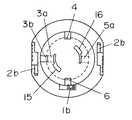 図4に示すとおり、電動工具本体側の正極端子17および負極端子18は、L型になっており、放電正極端子用溝15および放電負極端子用溝16の広いほうにまず挿入され、その後の回転により、幅の狭いところに設置されている放電正極端子3aおよび放電負極端子5aと図5のように接続する。ここで、接触不良が起こらないようにばね19で、確実に端子同士を接触させる。