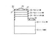 窒化物系化合物半導体層が成長したAlN基板31をMOCVD装置から取り出し、レジスト等を用いることによってマスクとし、アルカリ系の水溶液によってn型AlGaN層33が露出するまでエッチングし、メサ構造とした。その後、CVD装置によって、表面にSiO2膜37を約300nm形成した。この膜によってメサ構造側面に露出したpn接合界面付近のリーク電流は抑制され、素子の劣化は抑制される。The AlN substrate 31 on which the nitride-based compound semiconductor layer was grown was taken out of the MOCVD apparatus, used as a mask by using a resist or the like, and etched with an alkaline aqueous solution until the n-