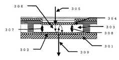 実施例3における干渉フィルタを説明する概略図を図3に示す。実施例1、及び、2の手段により作成された干渉フィルタは、透明基板301上に第1反射膜302、位相整合条件を満たす空間303を有し、第2反射膜304の上部に透明部材を有し、支柱によって支えられている。303の間隔は波長500nmの光を選択透過させる為、250nmになっている。入射光305は反射膜302と304の間で306に示すように反射、干渉を繰り返し、位相整合条件に合った波長のみ選択透過し、出射光309として得られる。