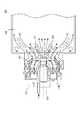 燃焼器1は、概略円筒体形状の小径の内側ケース2および大径の外側ケース3により環状体が形成され、その環状体内に配設された内側環状ライナ4および外側環状ライナ5により燃焼領域Rや混合・冷却領域および燃焼ガス流路を囲む内筒が形成されたアニュラ型燃焼器とされる。そして、この内筒の頭部(圧縮機出口1a側)に所要数の噴射装置Kが所定間隔で配設される。