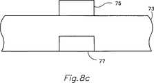 第9図は、マスキングおよびドーピングによってソース・バス・アセンブリ70ならびにドレイン電極78を含むように変更された単結晶シリコン層80の平面図である。また、ソース・ラインに沿って等間隔に離間した電気接触72も含まれる。第8b図に示されるように、これらの電気接触72は、単結晶シリコン層77上のLCDドライバ(図示せず)から延びるソース・バス・アセンブリ70のアルミニウム・ストリップ75との間の電気接続を行う。シリコン層とアルミニウム・ストリップの間に絶縁層が備えられる。アルミニウム・ストリップ75と単結晶シリコン層77の関係は、第8c図において明らかに理解できる。この実施形態についてのトランジスタ構成は、上述の第1の実施形態に示されるものと同じである。第3の実施形態と第1の実施形態の唯一の差異は、ソース・ラインに沿って接触72が含まれていることである。接触72は、事前設定された間隔をおいてピクセル開口を占拠するだけであり、残りのピクセルについては最大開口比を可能にする。これにより、所与のフォトリソグラフィ解像度に対して最大開口比が実現されると同時に、優れた動的性能が維持される。