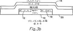 TFTの構造は、第3b図に示されるゲート・バスに沿った断面から明らかである。ソース・バスおよびドレイン・バスを画定するシリコン層を配置した後、次いで酸化物の層をこれらの部品上に堆積させる。次いで、ソース・バスと交差するように、ゲート・バスを酸化物層上に堆積させる。シリコン層10のソース領域12はドレイン領域16の近くにあり、トランジスタを通る電流は、ゲート・バス14上を伝播する信号によって制御される。透明電極を通る切断面である第3c図に示される断面は、ピクセル電極18のソース・バス12に対する近接を示す。