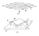 また、微小なミラーの変形によって2次元表示が可能な表示素子としてデジタルマイクロミラーデバイス(DMD)も提案されている。これは、図9(a)に斜視図を示すように、各画素に対応する微小なミラーMが2次元的に配置され、所定アドレスのミラーM’を対角線を軸にして傾けることにより、ミラーM’に一定方向から入射する光を傾いていないミラーとは異なる方向へ反射させるようにして、2次元パターンを表示するようにしたものである("IEEE Spectrum Vol.30,No.11,pp.27-31参照)。図9(b)に各ミラーMの支持駆動構造を示すが、ミラーM各々は、1つの対角方向の角でシリコン基板S上に立てられた一対の支持ポストPにより捩じりヒンジTを介して支持されており、ミラーMの裏側の基板S上に設けられた一対の電極Eの一方に電圧を印加することにより、静電力によりヒンジT間の対角線を軸にしてミラーMの面が回転されるものである。