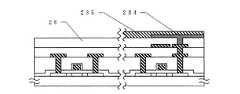 さらにラビング膜235を成膜する。ラビング膜は樹脂材料でなり、印刷法により形成する。本実施例においては、アクティブマトリクス回路の領域のみにラビング膜を形成する。ラビング膜235を成膜したら、ラビング処理を行う。  Further, a rubbing