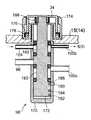 一方、ピストン172はシリンダ170に出没自在に支持されている。ピストン172の外周面には、周方向に二つの溝180、182が全周にわたって形成されている。ピストン172の頭部には、吸引ボタン34が取り付けられる。また、ピストン172は、吸引ボタン34とボタン受け174との間に介在させたスプリング188によって突出方向に付勢される。したがって、吸引ボタン34を押下操作すると、まず、図8に示すように、スプリング188が圧縮される。以下、この押下操作を第1段押下操作という。そして、吸引ボタン34をさらに押下操作すると、図9に示すように吸引ボタン34が円盤176を介してスプリング178を圧縮し、ピストン172がシリンダ170に没入される。以下、この押下操作を第2段押下操作という。第1段押下操作と第2段押下操作では、スプリング178の分だけ抵抗力が大きくなるので、操作感が変化する。よって、第1段押下操作と第2段押下操作を区別して操作することができる。  On the other hand, the
