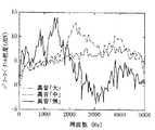 ところが、ラトル異音の大きさの違いによる顕著な違いは図14に示す時間波形、図15に示す周波数分布共に認めらず、僅かに図15に示す周波数分布において、2200Hz前後で若干の差が認められるに過ぎない。この原因は、ひとつには非定常性(断続性)を強く帯びたラトル異音の分析にパワースペクトルのような定常振動分析法を適用したためであり、もうひとつにはラトル異音よりも加振振動の大きさが大きく勝るためであると考えられる。