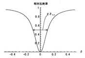 図4は上式に従う反射特性(δ依存性)を例示したグラフ図であり、横軸に上記「δ」をとり、縦軸に相対反射率(0乃至1)をとって両者の関係を示したものである。尚、グラフ曲線については、見易さを考慮して「R1=Rm=0.90」とし、かつフィネスを実際よりも低めに設定している。
