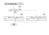 ステップ101において、第1の比較値V1が第2の比較値V2よりも小さいと判定されたとき、ステップ102が実行される。すなわち、左右方向に位置する画素の輝度値の方が上下方向に位置する画素の輝度値よりも対象画素の輝度値に近いとき、各画素に対して左右に1画素ずれた2つのG信号の相加平均が第1のG信号gとして求められる。これに対し、ステップ101において第1の比較値V1が第2の比較値V2よりも小さくないと判定されたとき、すなわち上下方向に位置する画素の輝度値の方が左右方向に位置する画素の輝度値よりも対象画素の輝度値に近いとき、各画素に対して上下に1画素ずれた2つのG信号の相加平均が第1のG信号gとして求められる。ステップ102または103の実行により、第1のG補間処理ルーチンは終了する。