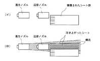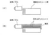 【図1】  近接ノズルのエア噴射によりシートが浮き上がる様子を説明する模式図であり、(イ)は噴射前、(ロ)は噴射中を示す。