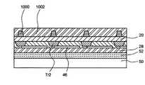 また、本願発明に類似した液晶表示装置の構成としては、例えばTFTの下層にカラーフィルタを配置した構造(特開平3−72322)、 TFTの下層にブラックマトリクスを配置した構造(特開平8−288519)、等が記載されている。しかしながら、これらの構造を有する液晶表示装置の製造プロセスでは、カラーフィルタ及び/またはブラックマトリクスが形成された基板を用いて、既に述べたような高温を要するTFTの製造プロセスを実施しなければならない。従って、カラーフィルタ及び/またはブラックマトリクスを構成する材料としては、TFTのプロセス温度以上の耐熱性を持つ材料に特化しなければならない。