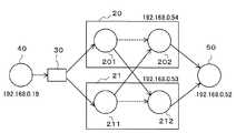 図3は、クライアント装置40、ウェブサーバ20及び21、データベース・サーバ50、負荷分散装置30からなるウェブシステムの概念図である。ウェブサーバ20,21は同様にHTTPサーバプログラム201,211とウェブアプリケーションサーバプログラム202、212が実行される。ウェブサーバ20と21により、ウェブサーバは2重に冗長化されている。ウェブサーバ20及び21は、負荷分散装置30を介してクライアント装置からのアクセスが行われる。  FIG. 3 is a conceptual diagram of a web system including the