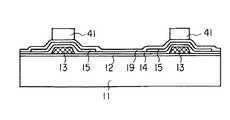 まず、図2に示すように、大型のガラス基板11上に、プラズマCVD法により窒化シリコン膜12を成膜した後、スパッタ法を用いてビスマス・サーメット13を300nmの膜厚で成膜する。その後、写真食刻法により、ビスマス・サーメット13上に所定パターンのフォトレジストを形成した後、反応性イオンエッチング法によりビスマス・サーメット13を島状にパターニングする。この時、島状に形成されたビスマス・サーメット13の側壁は、ガラス基板11に対して、急峻な角度で形成され、その角度は、例えば、ガラス基板11に対して80度である。