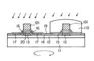 続いて、図8に示すように、p型TFTを形成するべき領域をフォトレジスト110で被覆し、n型TFTを形成するべき領域に不純物を導入するため、イオンドーピング法を用いて不純物、すなわちイオンを注入する。まず、ガラス基板11に対して垂直な方向、すなわちガラス基板11の法線に平行な方向からイオンを入射し、酸化シリコン膜19を介して多結晶シリコン膜15におけるソース領域及びドレイン領域17に不純物を注入する。n型のTFTを形成する場合には、例えば、ホスフィンガス(PH3 )を原料ガスとして用いたイオンを不純物として使用する。イオン注入量は、例えば5×1015/cm2 であり、加速電圧は、例えば60kVでイオン注入を行う。この工程では、ガラス基板11の法線方向からイオンを入射させるため、ガラス基板11に沿って平坦に形成された多結晶シリコン膜15に対して積極的にイオンを注入している。多結晶シリコン膜15において、ゲート電極101の直下に位置しているために、ほとんどイオンの注入を受けない領域は、活性領域20として機能する。