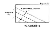 これにより、燃料噴射弁21には、燃料噴射用ポンプ22から前記基本燃料噴射圧力Pcrbaseまで昇圧された燃料が供給されるようになっている。また、燃料噴射弁21は、電気制御装置60と電気的に接続されていて、同電気制御装置60からの駆動信号(後述する燃料噴射量qfinに応じた指令信号)により所定時間だけ開弁し、これにより各気筒の燃焼室内に前記基本燃料噴射圧力Pcrbaseにまで昇圧された燃料を前記燃料噴射量qfinだけ直接噴射するようになっている。  Thereby, the